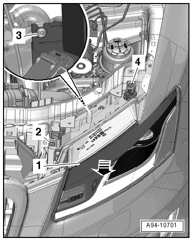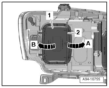 - Push the headlamp housing - 1 - forward all the way in the direction of the - arrow -.