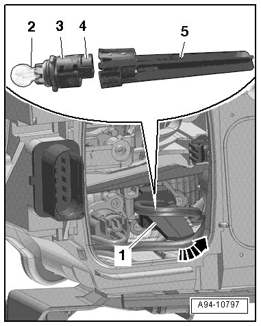 - Release the spring - 4 - and disconnect the bulb connector - 2 -.