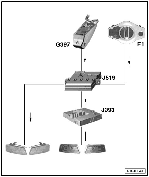 The comfort system central control module (J393) switches on the tail lamps and the vehicle electrical system control module switches on the headlamps. The illumination for the instrument cluster and the switches will also be switched on.