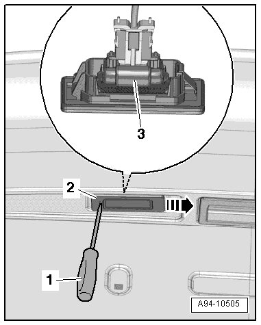 - Remove the marker lamps - 2 - from the rear lid by positioning a screwdriver - 1 - at the slit and sliding it in the direction of the - arrow -.