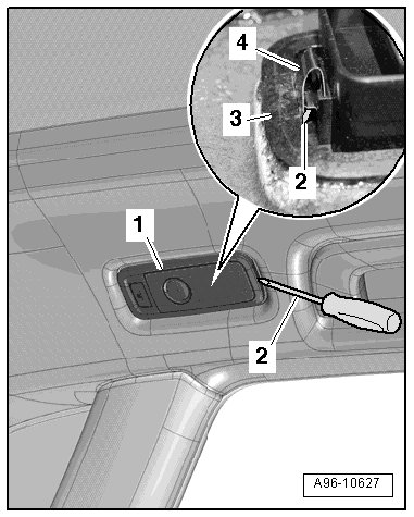 - Release the interior lamp retaining clip - 1 - by pushing the clip - 4 - through the opening with a narrow screwdriver - 2 -.