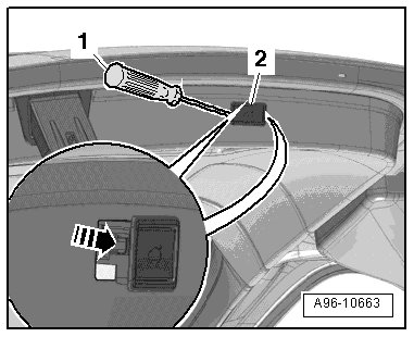 - Release the left and right clips in the direction of the - arrow - with a narrow screwdriver - 1 - on the rear lid lock button in luggage compartment (E406) - 2 -.