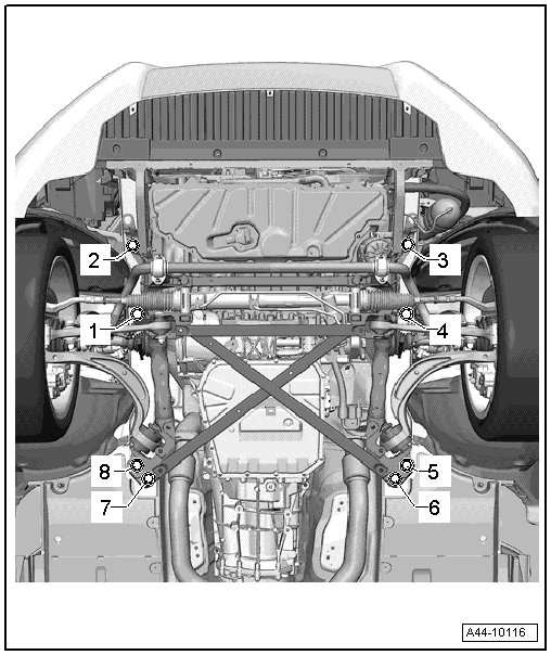 - Install the new bolts - 8 - and - 5 - one after another and tighten. Refer to => [ Subframe, Crossbrace, Stabilizer Bar, Coupling Rod and Subframe Shield Assembly Overview ] Subframe, Crossbrace, Stabilizer Bar, Coupling Rod and Subframe Shield Assembly Overview.