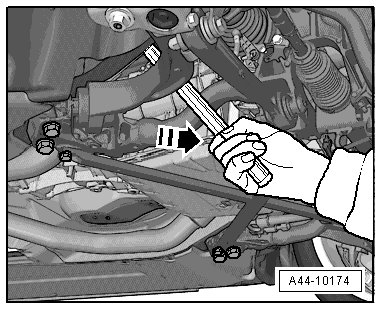 Depending on the engine version, the subframe shield must be loosened in order to be able to mount the plastic coated tire iron for moving the subframe.