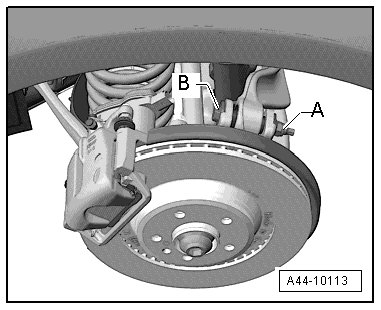 - Remove the nut - A - of threaded connection of wheel bearing housing/control arm, and screw on new nut until stop.