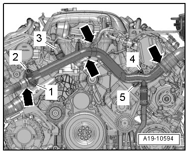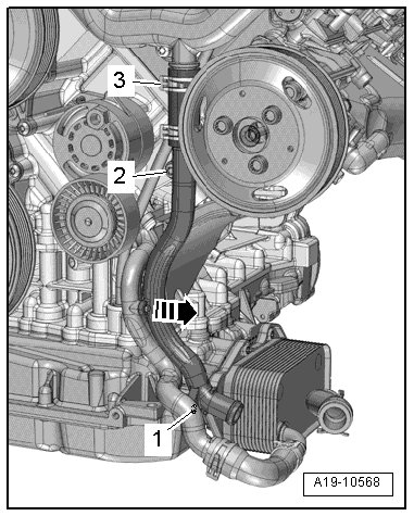 - Open the clamp, loosen the hose clamp and remove the front coolant pipe from the coolant hoses - arrows -.
