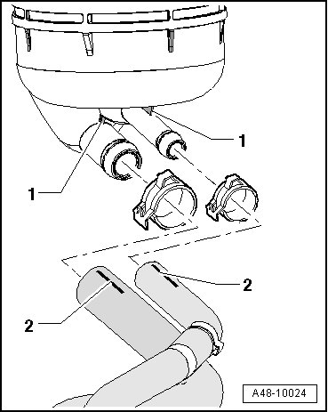 • The markings - 2 - on the lines must align with the bars - 1 - on the reservoir.