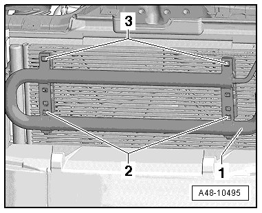 - Position the hydraulic oil cooler - 1 - on the brackets - 2 - and then engage it into the brackets - 3 -.