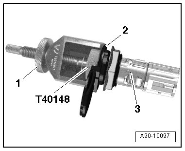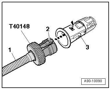 - The release tabs - 2 - on the release tool for cigarette lighter (T40148) must engage in the openings in the 12V socket - 3 - - arrow - and the threaded pin - 1 - must slide down as far as the stop.