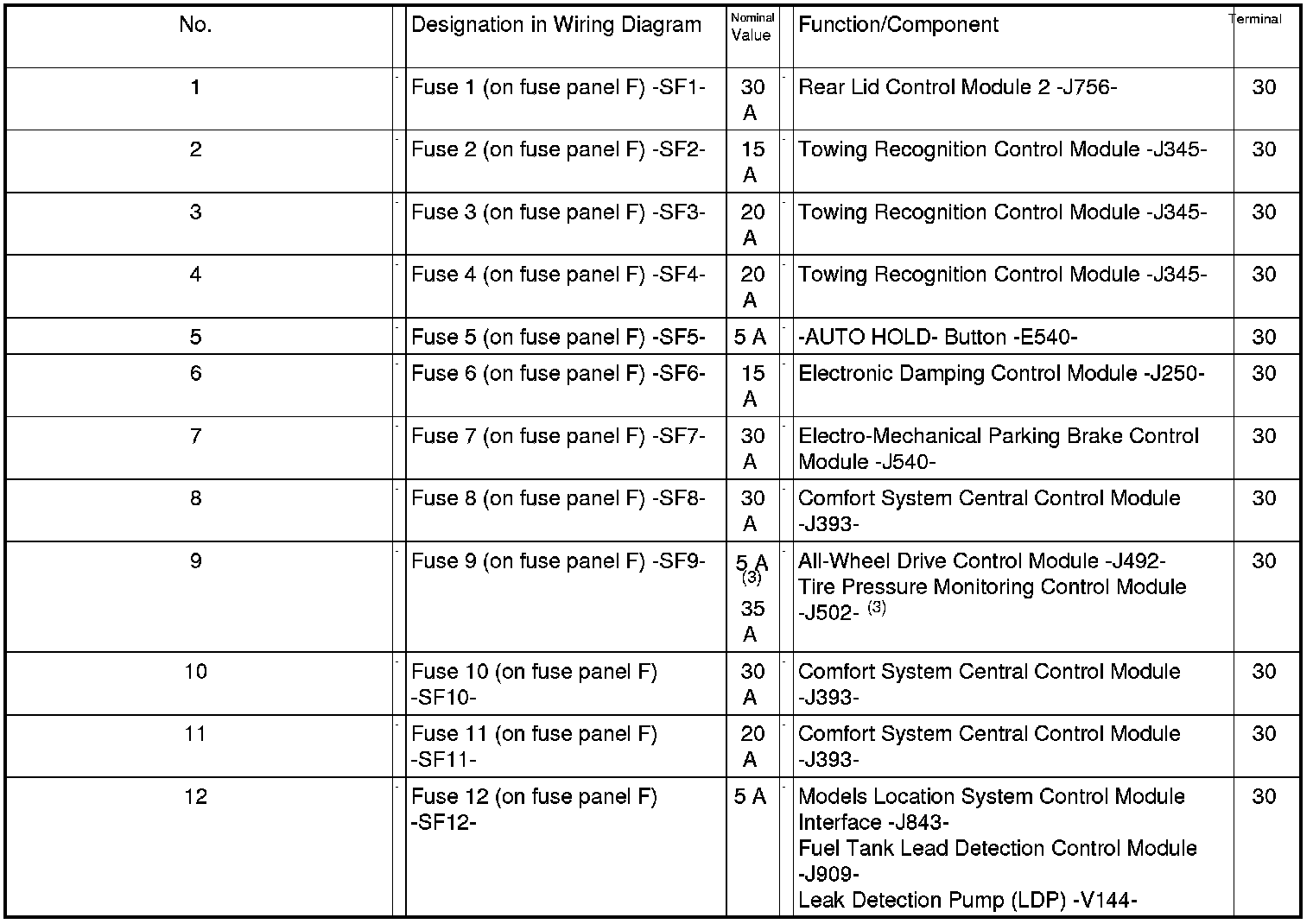 Fuses in Fuse Carrier ST3 on Fuse Panel F -SF- (brown)