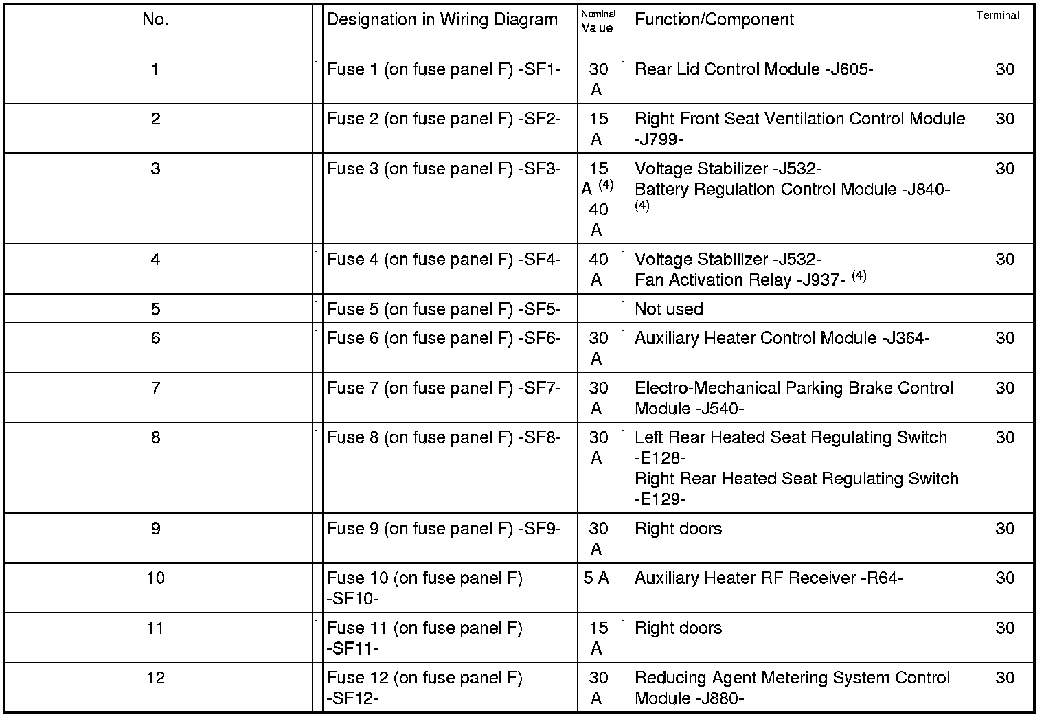 Fuses in Fuse Carrier ST4 on Fuse Panel F -SF- (red)