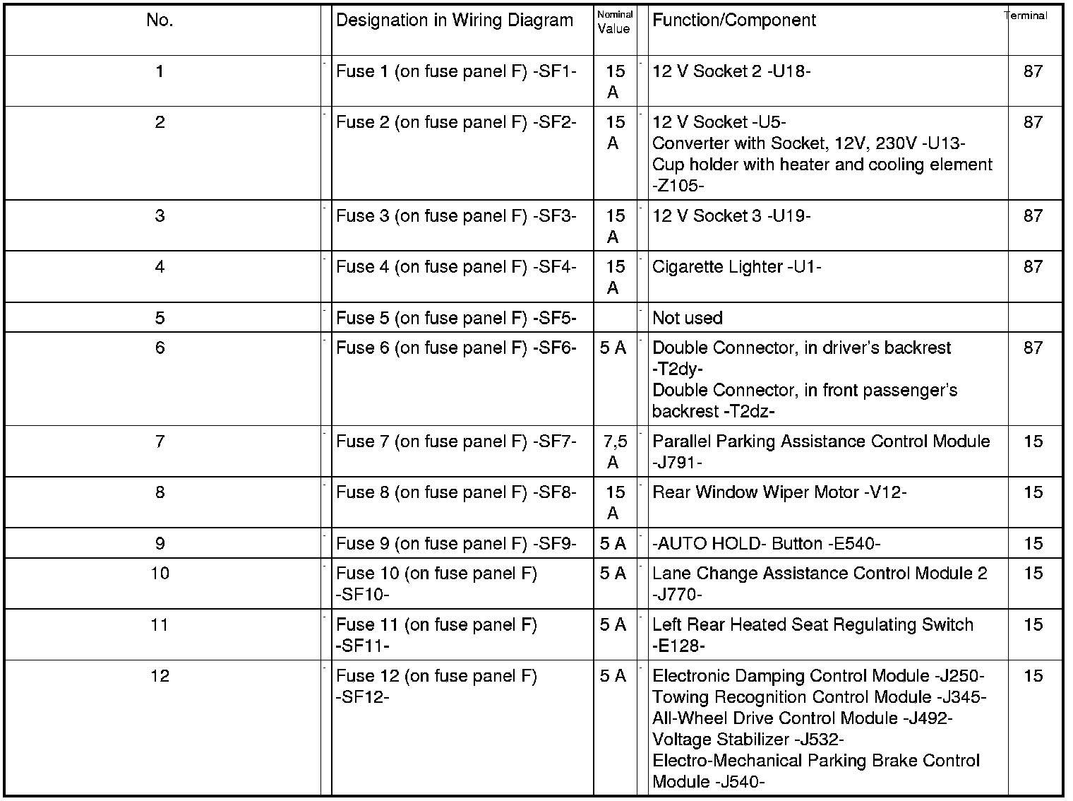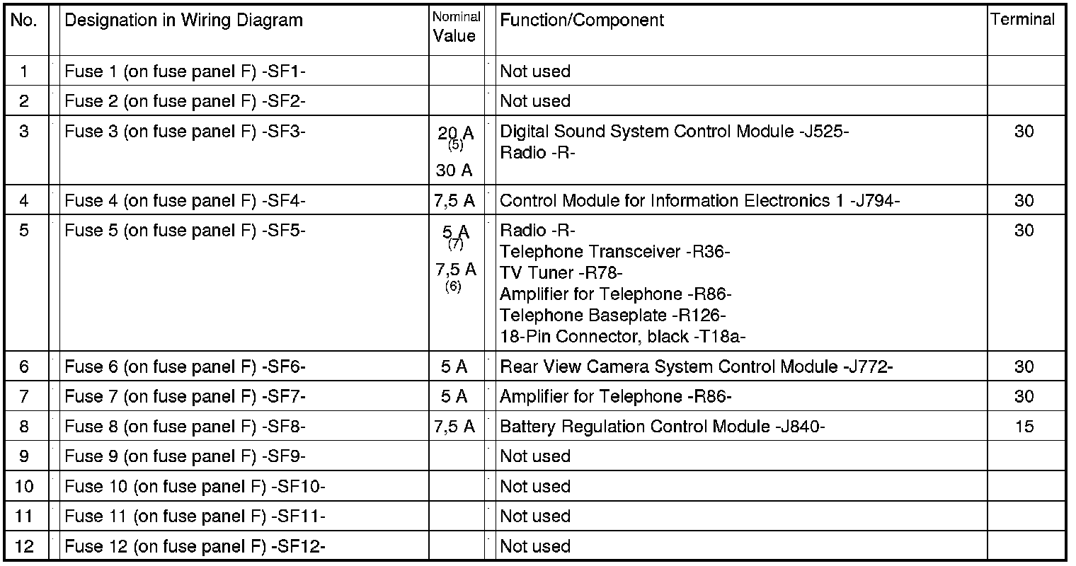 Fuses in Fuse Carrier ST5 on Fuse Panel F -SF- (black)