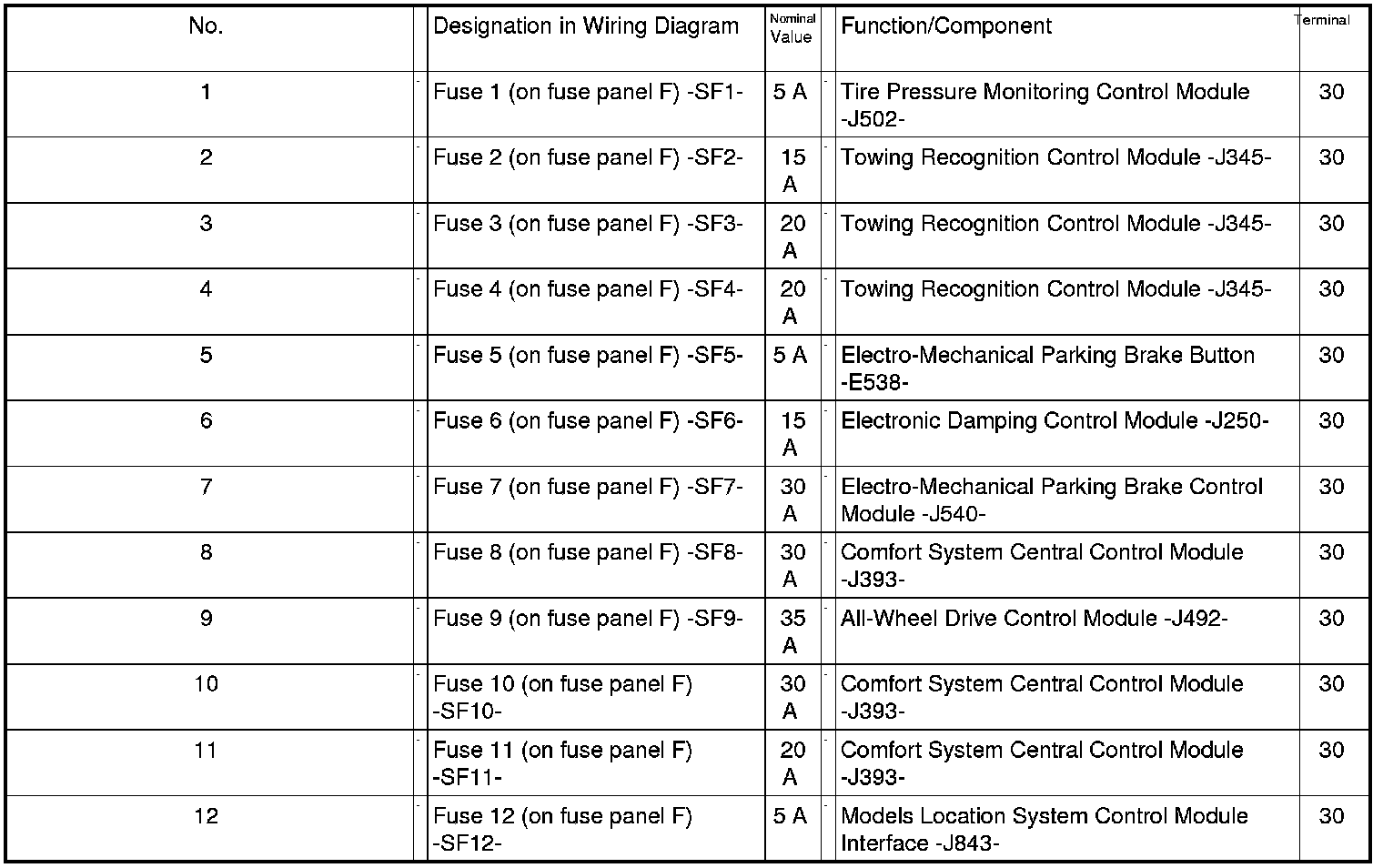 Relay /Fuse Panel F -SF- through model year 2009