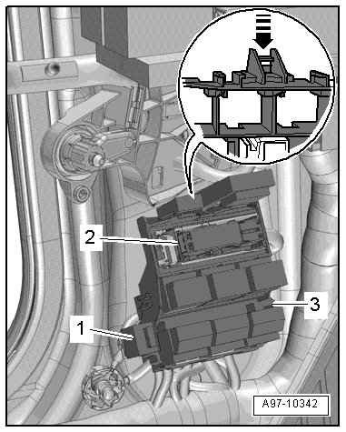 - Press the retaining clip in the direction of the - arrow - and disengage the connector station - 3 - at the A-pillar.
