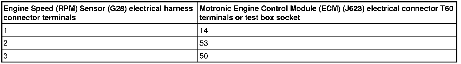 - Using a multimeter, check the Engine Speed (RPM) Sensor (G28) electrical harness connector terminals to the Motronic Engine Control Module (ECM) (J623) electrical harness connector T60 terminals for an open circuit.
