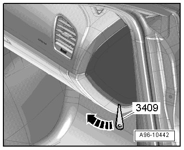 - Pry the instrument panel side cover off with the (3409) in the direction of the - arrow - and remove it.