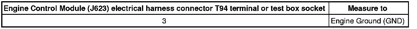 - Check the Engine Control Module (J623) electrical harness connector T94 terminal 3 to the Battery (A) positive terminal for an open circuit or short to Ground (GND).