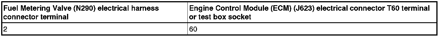 - Using a multimeter, check the Fuel Metering Valve (N290) electrical harness connector terminal 2 to the Engine Control Module (ECM) (J623) electrical harness connector T60 terminal 60 for resistance.
