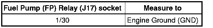 - Check the Fuel Pump (FP) Relay (J17) socket 1/30 to the Battery for an open circuit or short to Ground (GND).