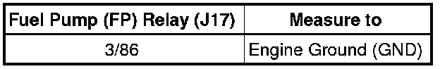 - Check the Fuel Pump (FP) Relay (J17) socket 3/86 to the fuse SC 2 for an open circuit or short to Ground (GND).