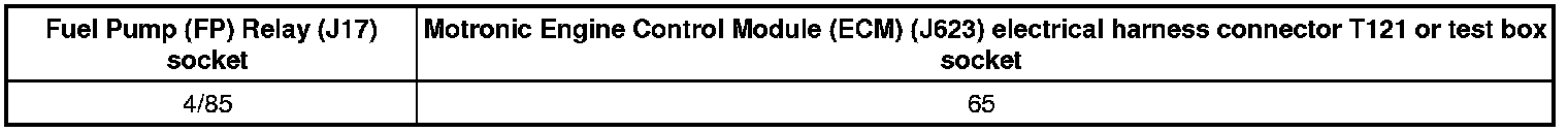 - Check the Fuel Pump (FP) Relay (J17) socket 4/85 to the Motronic Engine Control Module (ECM) (J623) electrical harness connector T121 terminal 65 for an open circuit or a short to Battery (+).