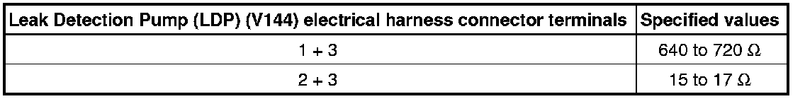 - Using a multimeter, check the Leak Detection Pump (LDP) (V144) for resistance as follows: