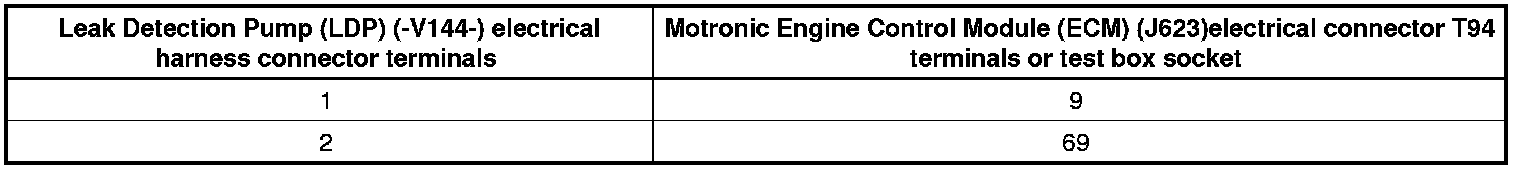 - Using a multimeter, check the Leak Detection Pump (LDP) (-V144-) electrical connector terminal 1 to Motronic Engine Control Module (ECM) (J623) electrical connector T94 terminal 9 for an open circuit.