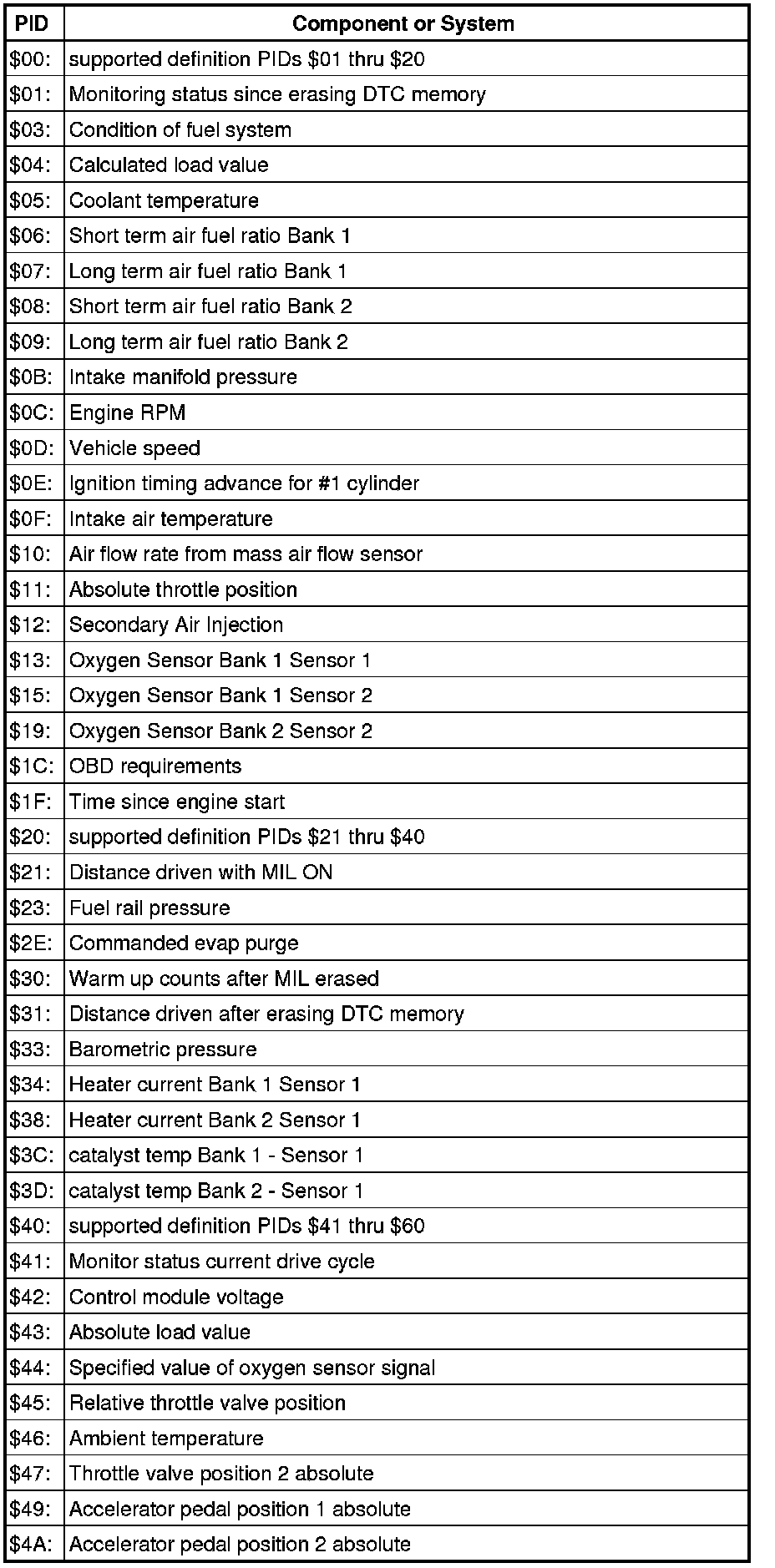 - From the following table, select the desired the "PID" that is to be monitored, e.g. "PID $05 Coolant temperature".
