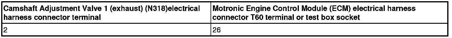 - Using a multimeter, Check the Camshaft Adjustment Valve 1 (exhaust) (N318) electrical harness connector terminal 2 to the Motronic Engine Control Module (ECM) electrical harness connector T60 terminal 26 for an open circuit.