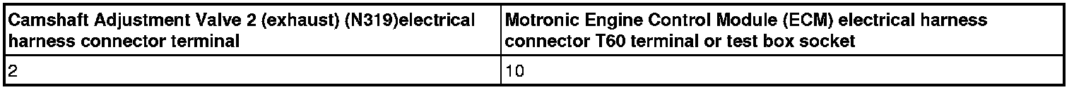 - Using a multimeter, Check the Camshaft Adjustment Valve 2 (exhaust) (N319) electrical harness connector terminal 2 to the Motronic Engine Control Module (ECM) electrical harness connector T60 terminal 10 for an open circuit.