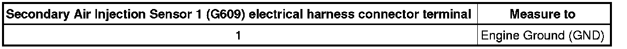 - Using a multimeter, check the Secondary Air Injection Sensor 1 (G609) electrical harness connector terminal 1 for voltage.