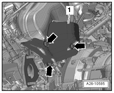 - Tighten the heat shield bolts - arrows - to 9 Nm heat shield - 1 -.