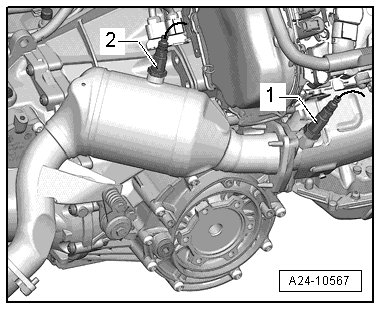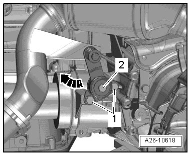 - Remove the bolt - 2 -, press the retaining tab off the transmission and tilt it back - arrow -.