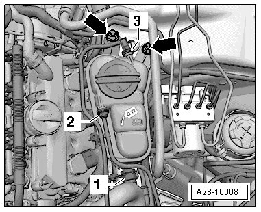 - For cylinder 2 and 3 ignition coils, remove the air guide hose (open the hose clamp - 3 - and the clips - arrows -).