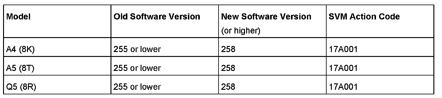 2. Update the instrument cluster (J285) using the SVM action code as listed in the table below if necessary.