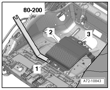 - Remove the seat pan cover and cushion by first guiding the passenger occupant detection system pressure sensor (G452) together with the wiring harness out through the opening in the seat pan. Then the passenger occupant detection system control module (J706) must be guided out through the opening.