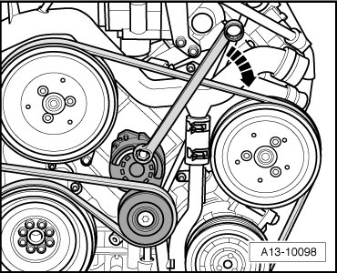 - Pivot tensioner in the direction of the- arrow - to release tension on ribbed belt.