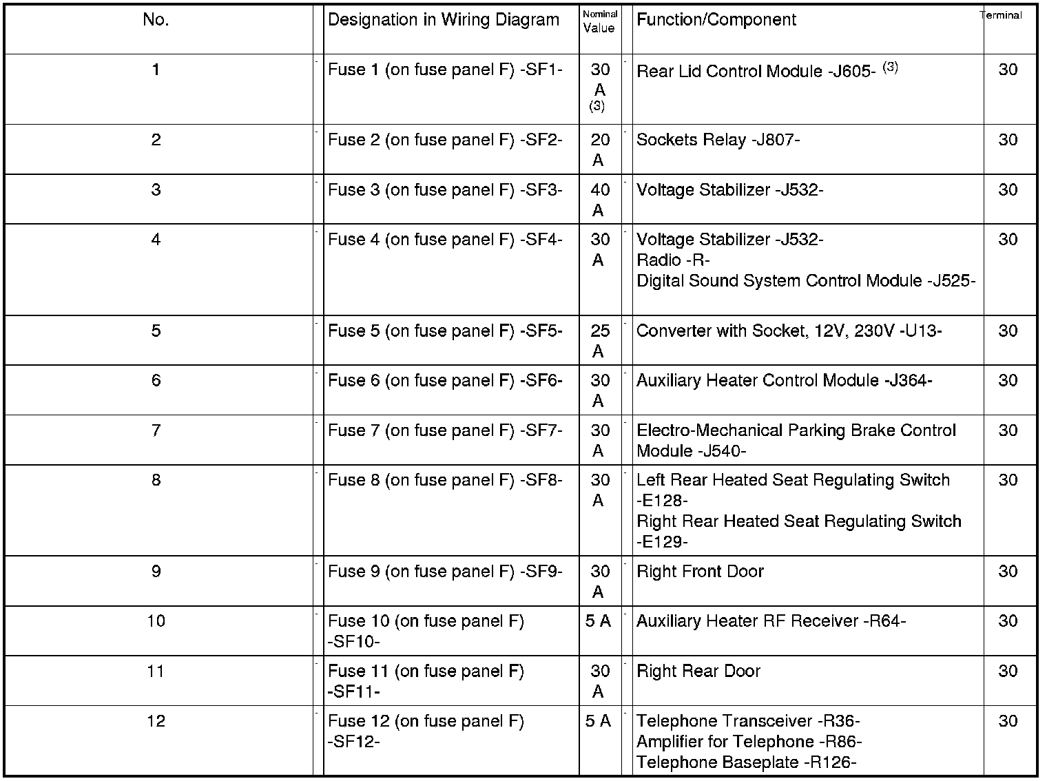 Fuses in Fuse Carrier ST3 on Fuse Panel F -SF- (brown)