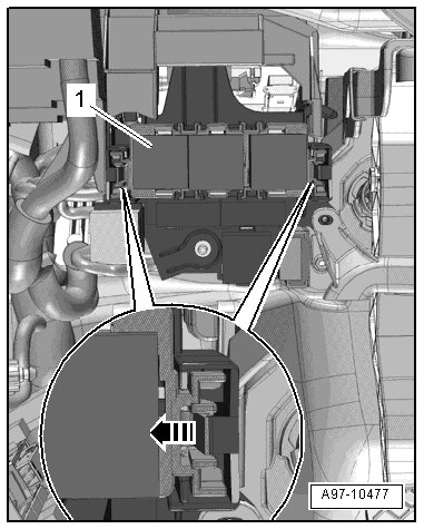 - Disengage the 3-pin relay/fuse panel by pressing the retaining springs in the direction of the - arrow - and remove the relay/fuse panel - 1 -.