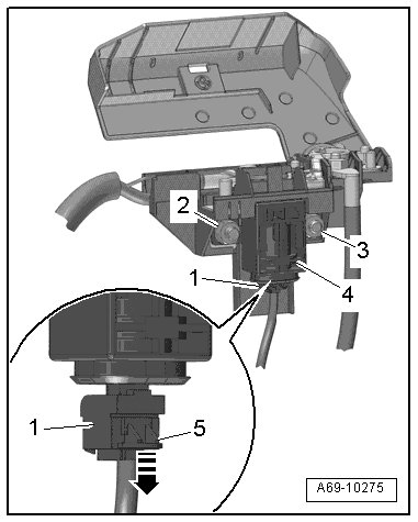 - Press and remove the lock - 5 - - arrow - and disconnect the connector - 1 -.