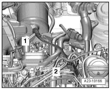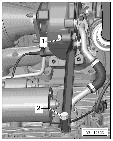 - Remove the bolts - 1 - and - 2 - and the turbocharger support.
