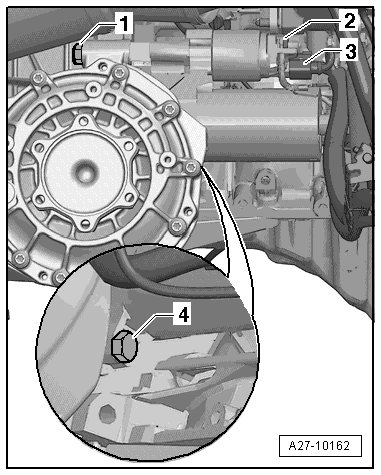 - Remove the bolts - 1 - and - 4 - and the starter.