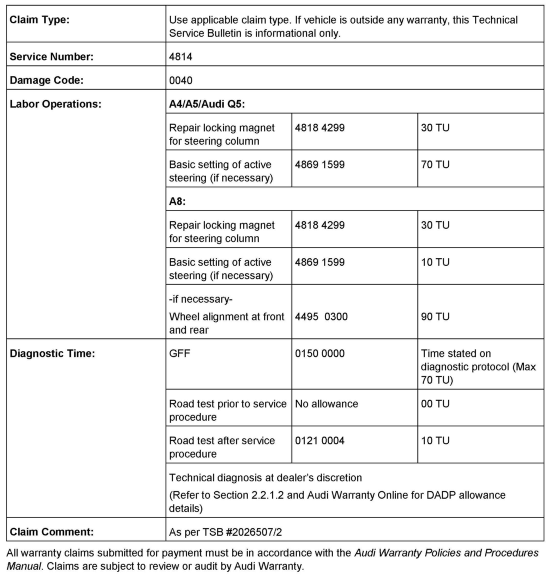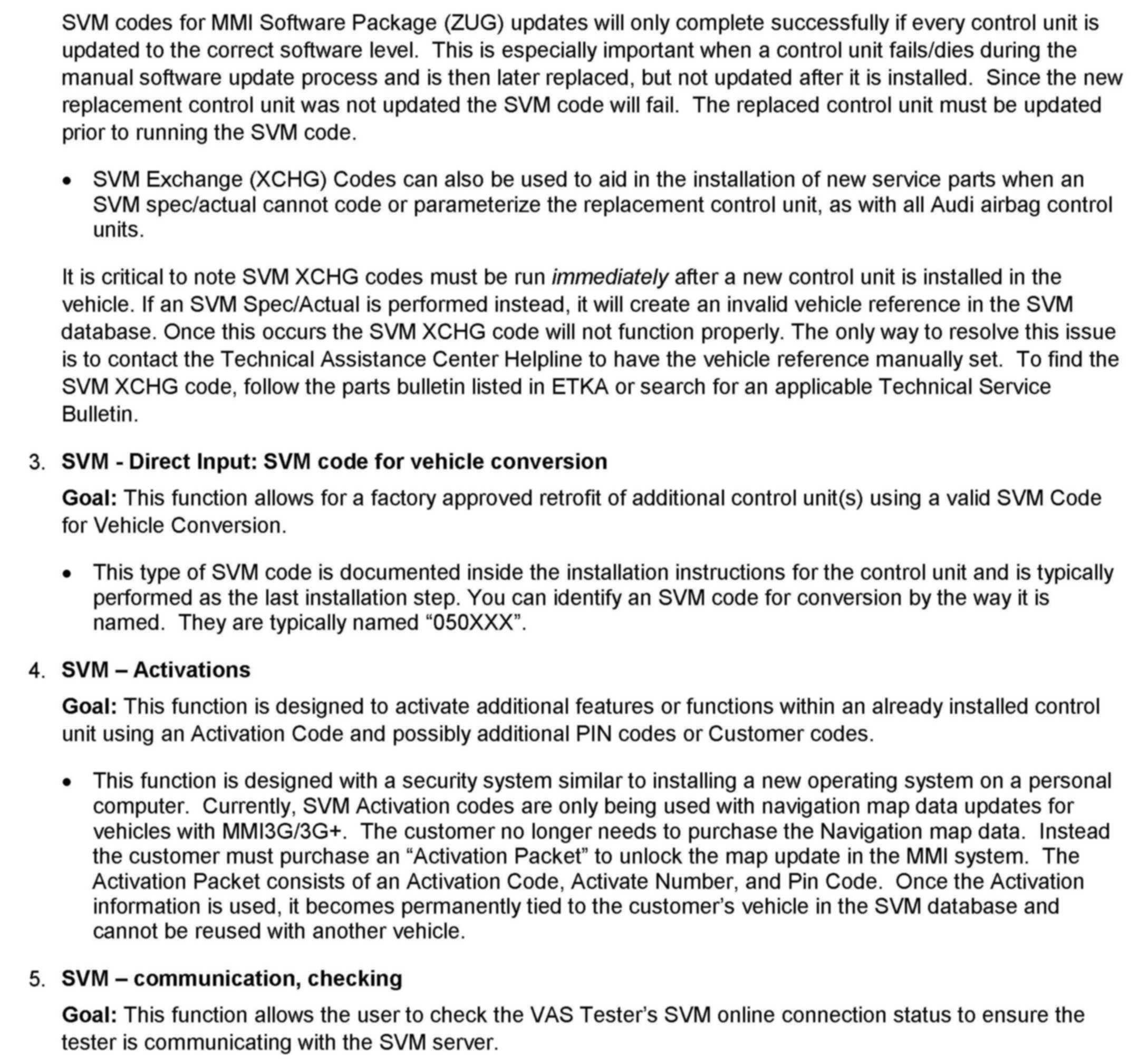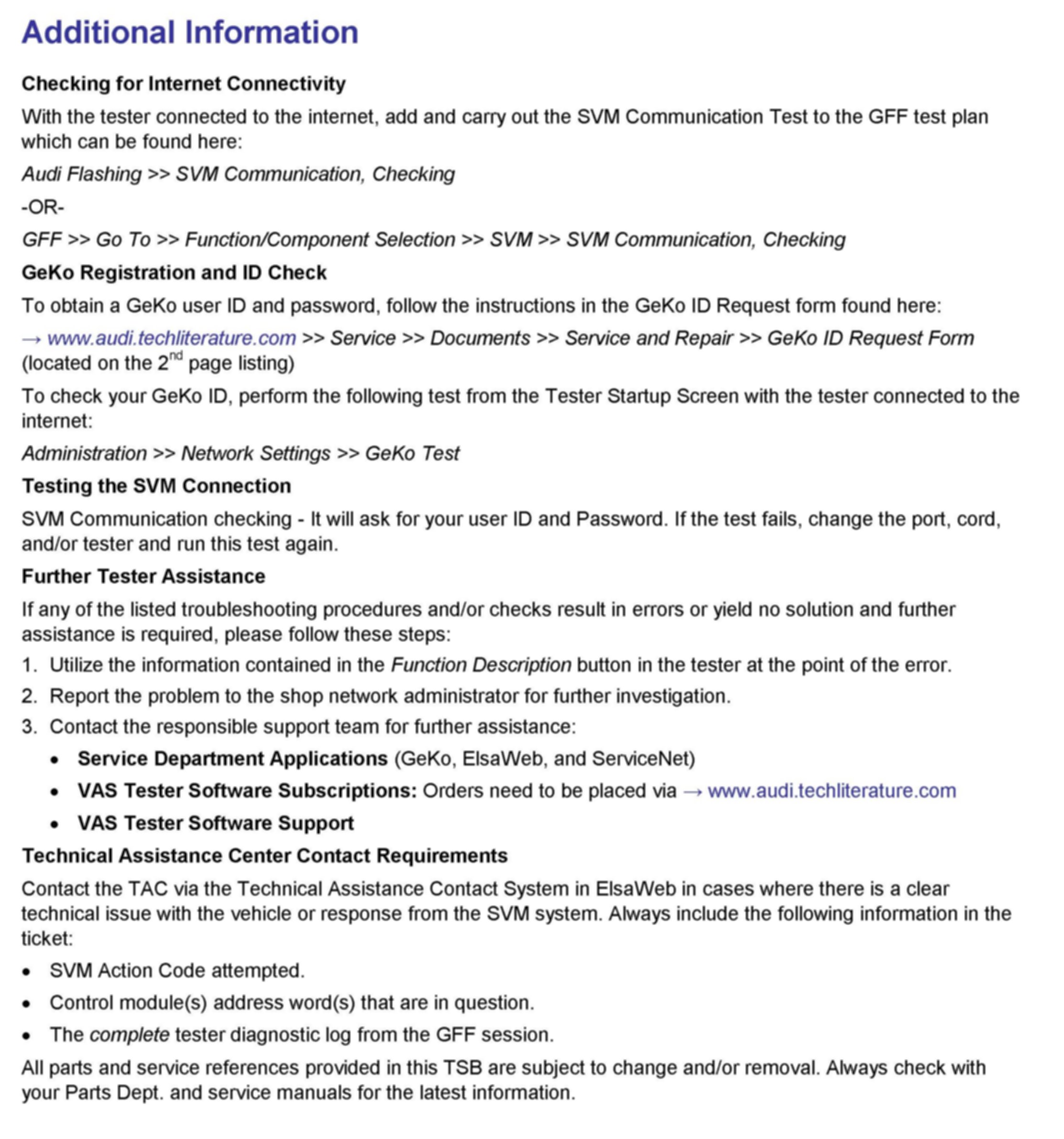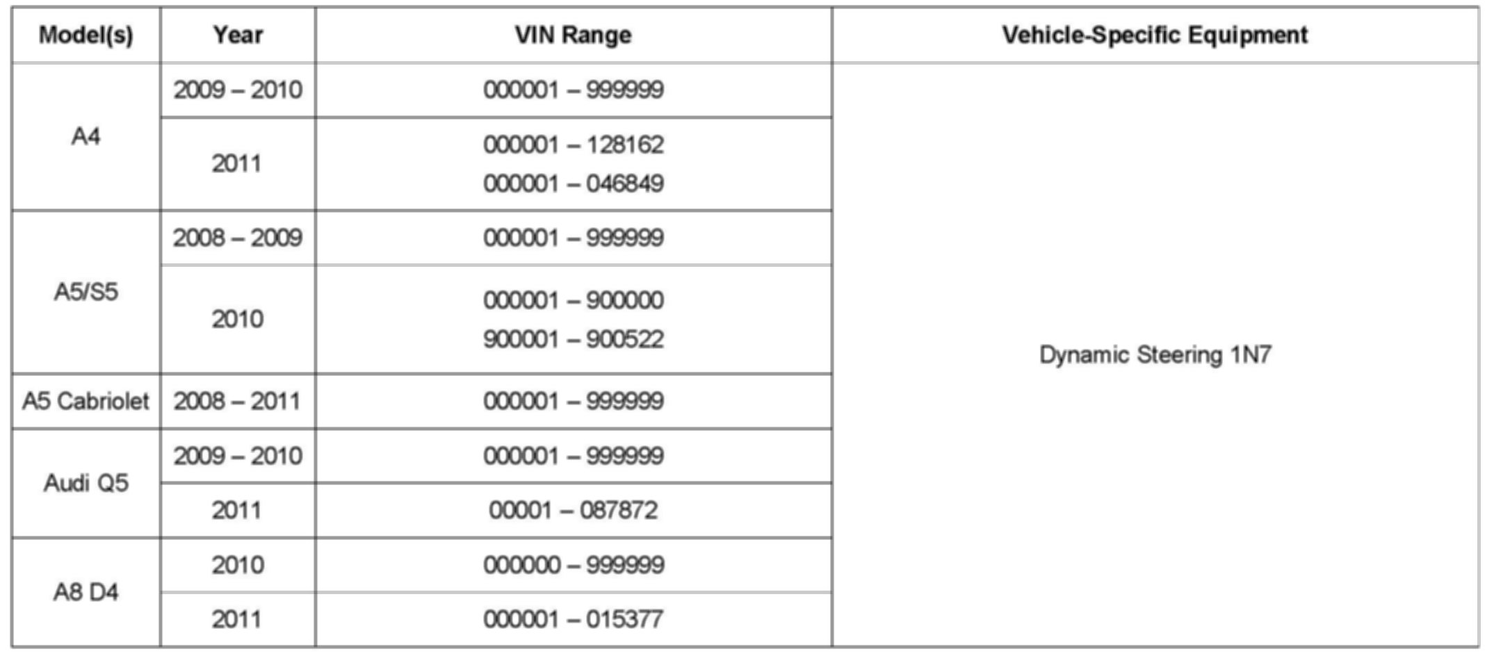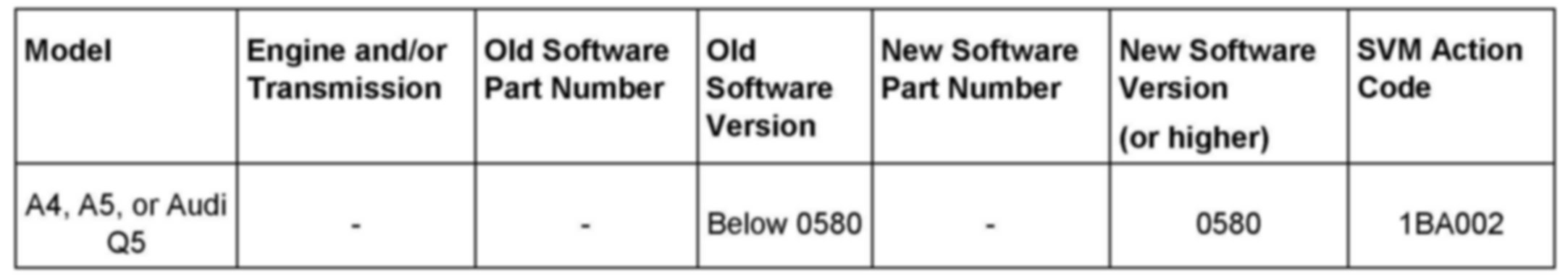 ^ On an A4, A5, or Audi Q5 check the software level of the active steering module, address word 1B. Update the 1B module to software level 0580, if necessary, using the table below. If updating from a software level below 0570, the basic settings must be performed after the SVM update.