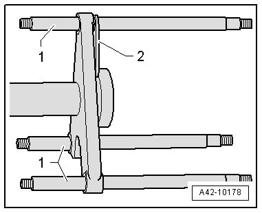 - Insert the rods from the (VAS 6274/10) with the long taper - 1 - into the tensioning system plate.