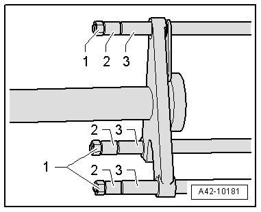 - Install the sleeves - 2 - and - 3 - from the (VAS 6274/10) and install the nuts - 1 - lightly.
