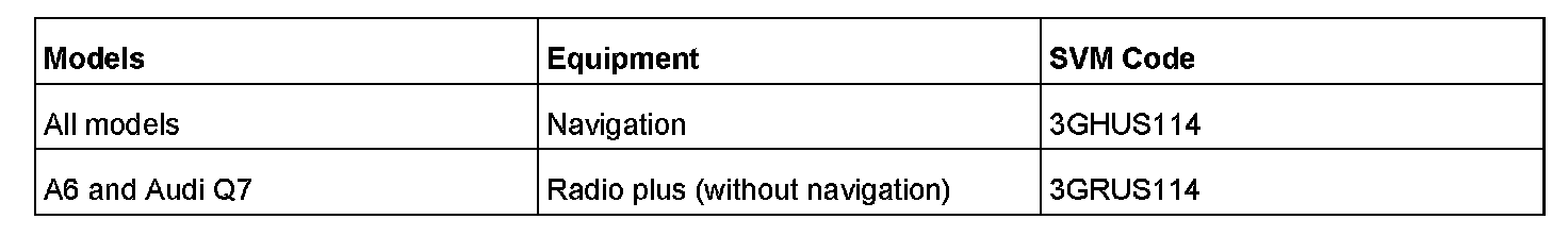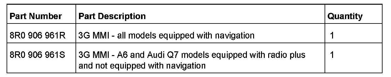Tip: For complete and detailed instructions for the 3G MMI system update, refer to the attached instructions. (Note: The attached instructions are generic. Some portions may not apply to this specific TSB. Importing and exporting customer code data is not necessary for this 3G MMI update system.)