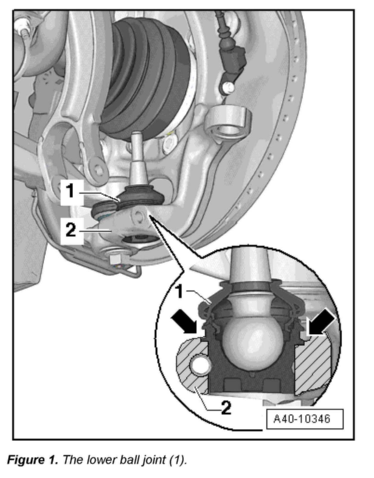 Place the vehicle on a lift and use chassis ears or other technique to determine whether the noises are caused by the lower ball joint (Figure 1, Point 1).