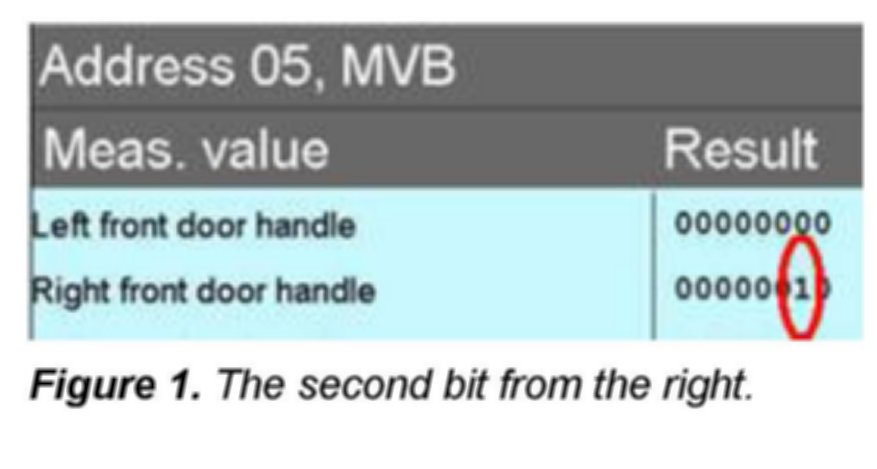 ^ In Measured Value Block 43 of the access/start authorization control module J518 (address word 05), the second bit from the right (Hall sensor) of the affected door handle is always 1.