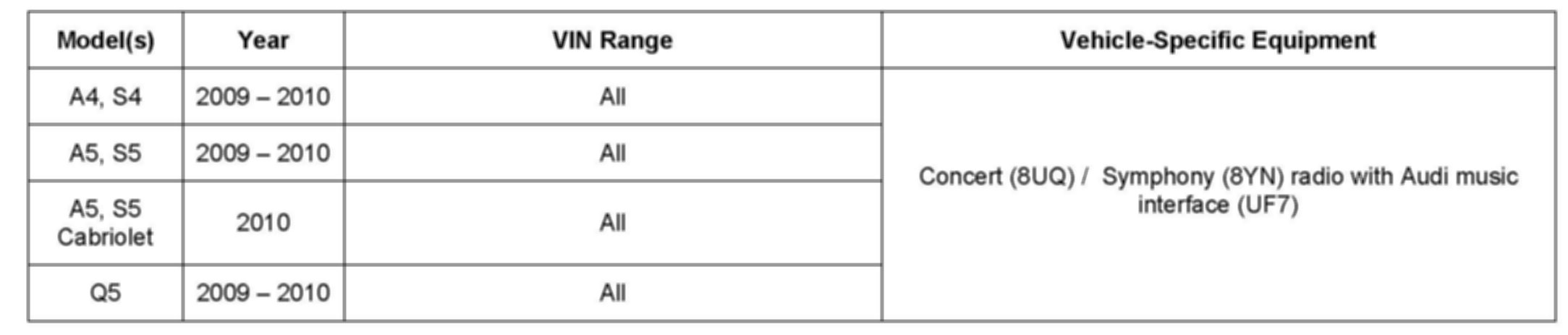 ^ Only vehicles with the CAN-based generation 3 radio (PR# 8UQ/8YN) and Audi Music Interface (PR# UF7) are affected.