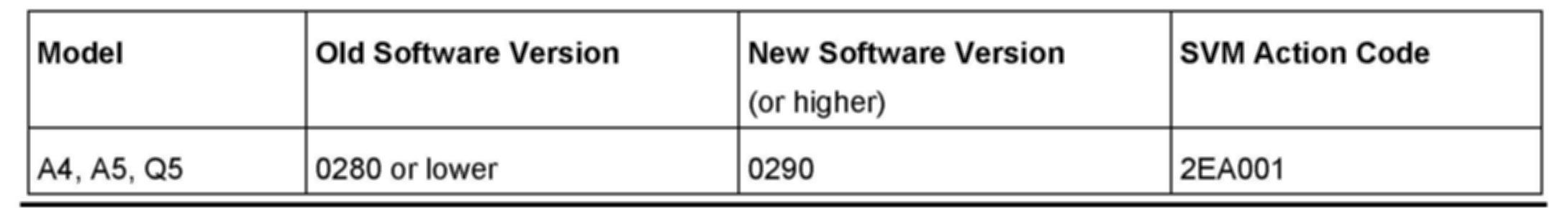 2. Update the Audi Music Interface (R199) using the SVM action code as listed in the table above if necessary.